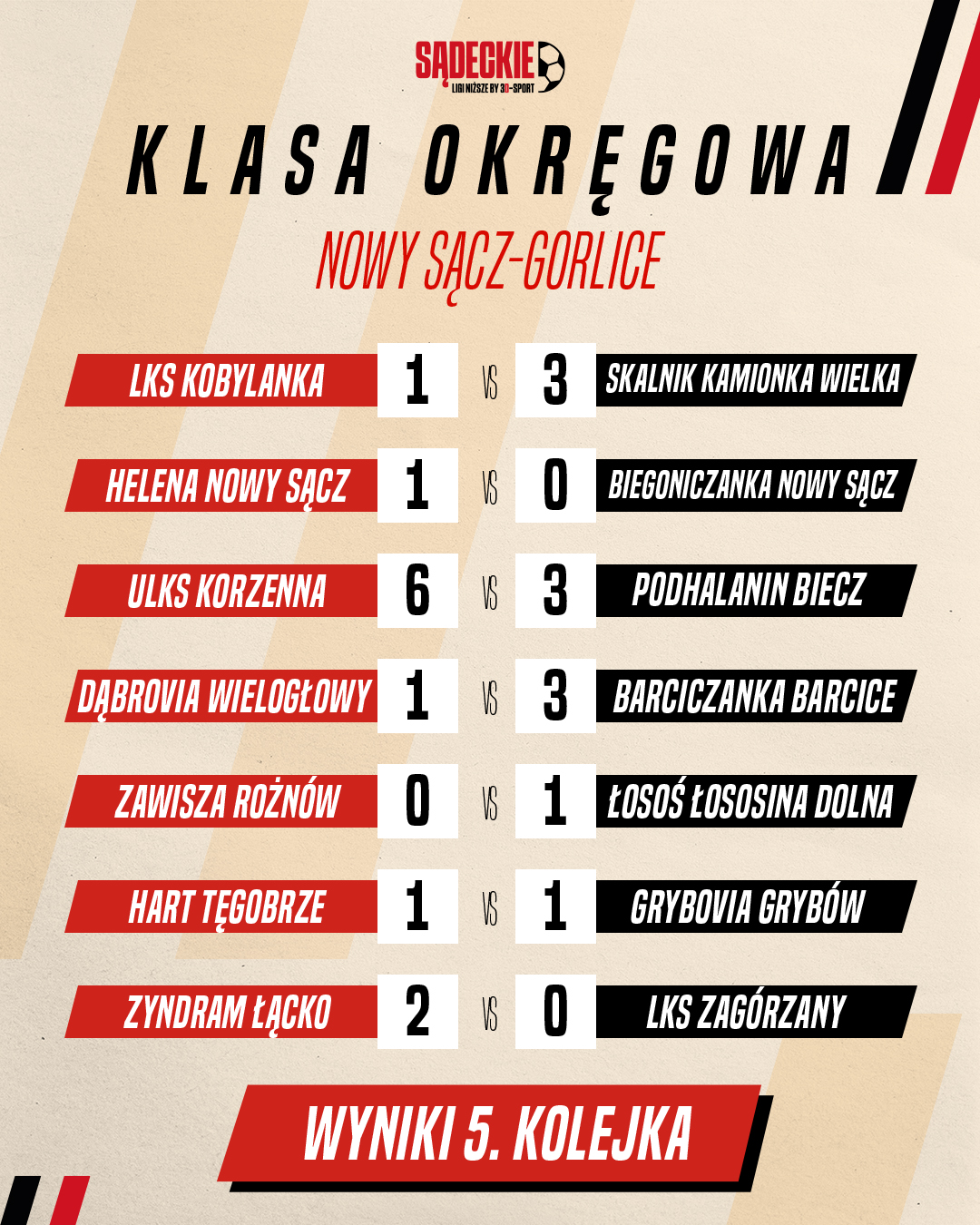 5. kolejka nowosądecko-gorlickiej Klasy Okręgwej oraz nowosądeckich Klas A i B to już historia. Dla jednych miła, a dla innych do jak najszybszego zapomnienia. Oto jak prezentuje się komplet wyników tej serii gier.