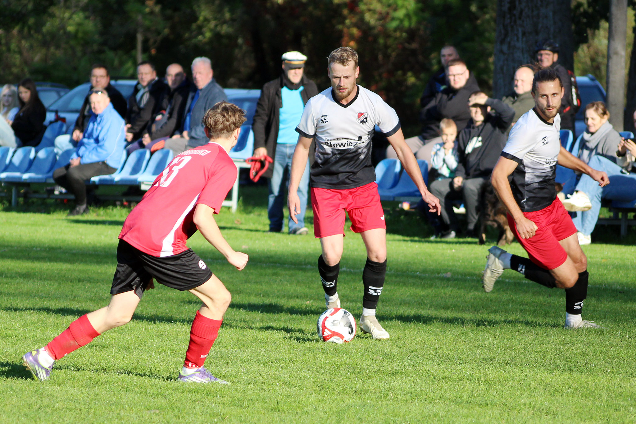 Podczas przerwy piłkarze z Jazowska musieli otrzymać sporą reprymendę od swojego trenera, gdyż zaraz po gwizdku rozpoczynającym drugą część gry ruszyli do odrabiania strat. Jednak gola kontaktowego zdobyli dopiero w 67. minucie. Jego autorem został Fabian Kołodziej, który wyszedł sam na sam z golkiperem, minął go i pewnym uderzeniem zmniejszył prowadzenie gości. Asystę przy tym trafieniu zaliczył Wojciech Burchel. Natomiast do wyrównania „Czerwono-czarni” doprowadzili dopiero pod koniec regulaminowego czasu gry. Wynik ustalił Ernest Jastrząb. Nie obyło się bez pomocy defensorów ze Świniarska, którzy całkowicie zgubili krycie oraz Andrzeja Pasiuta; golkiper przyjezdnych próbował wypiąstkować piłkę, ale zamiast tego praktycznie wpakował ją sobie do bramki. Z remisu ani jedni, ani drudzy nie mogą być zadowoleni. Budowlani, ponieważ mogą stracić miejsce premiowane awansem. LKS, bowiem wypuścił z rąk dwubramkowe prowadzenie i nie oddalił się od strefy spadkowej.
