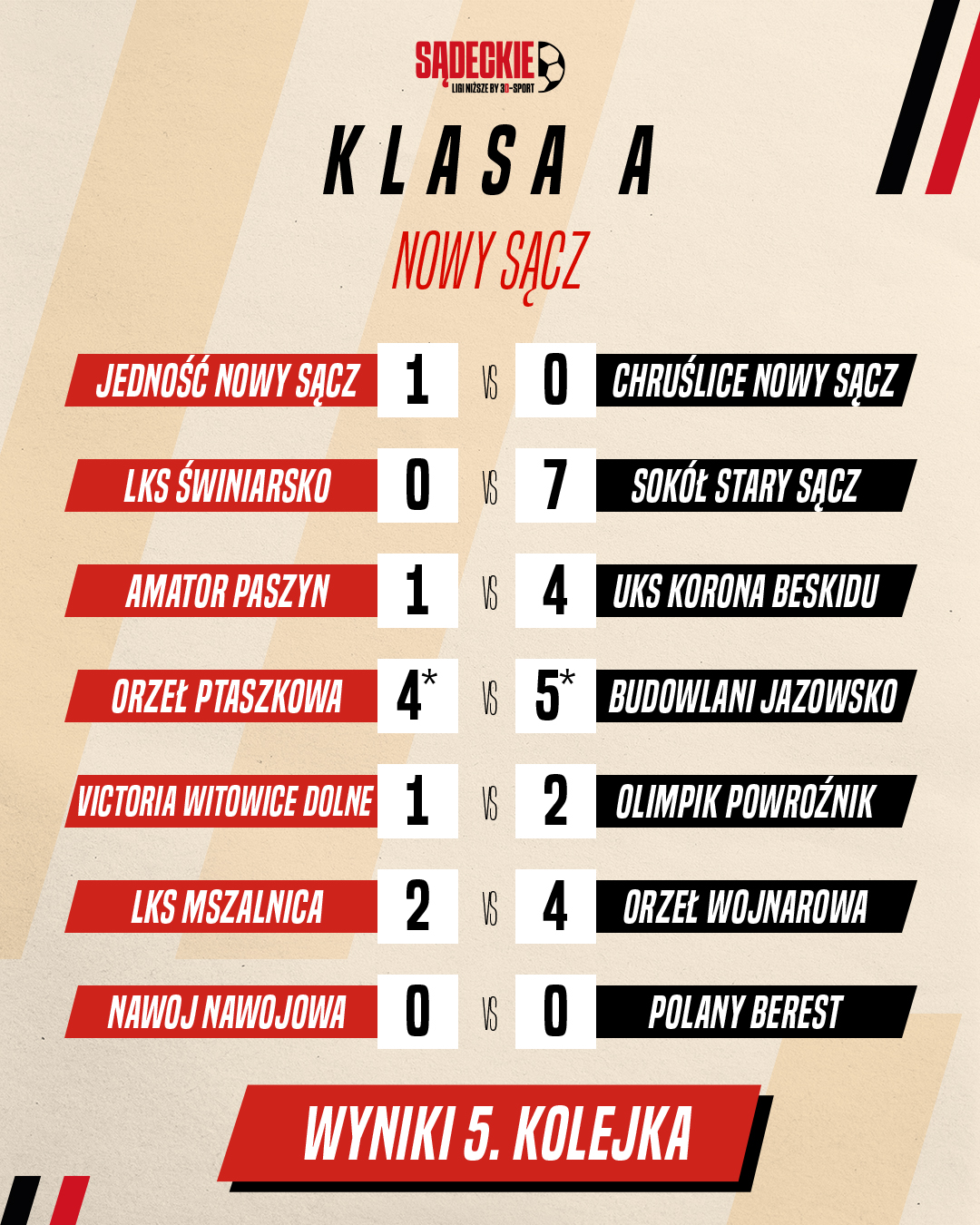 5. kolejka nowosądecko-gorlickiej Klasy Okręgwej oraz nowosądeckich Klas A i B to już historia. Dla jednych miła, a dla innych do jak najszybszego zapomnienia. Oto jak prezentuje się komplet wyników tej serii gier.