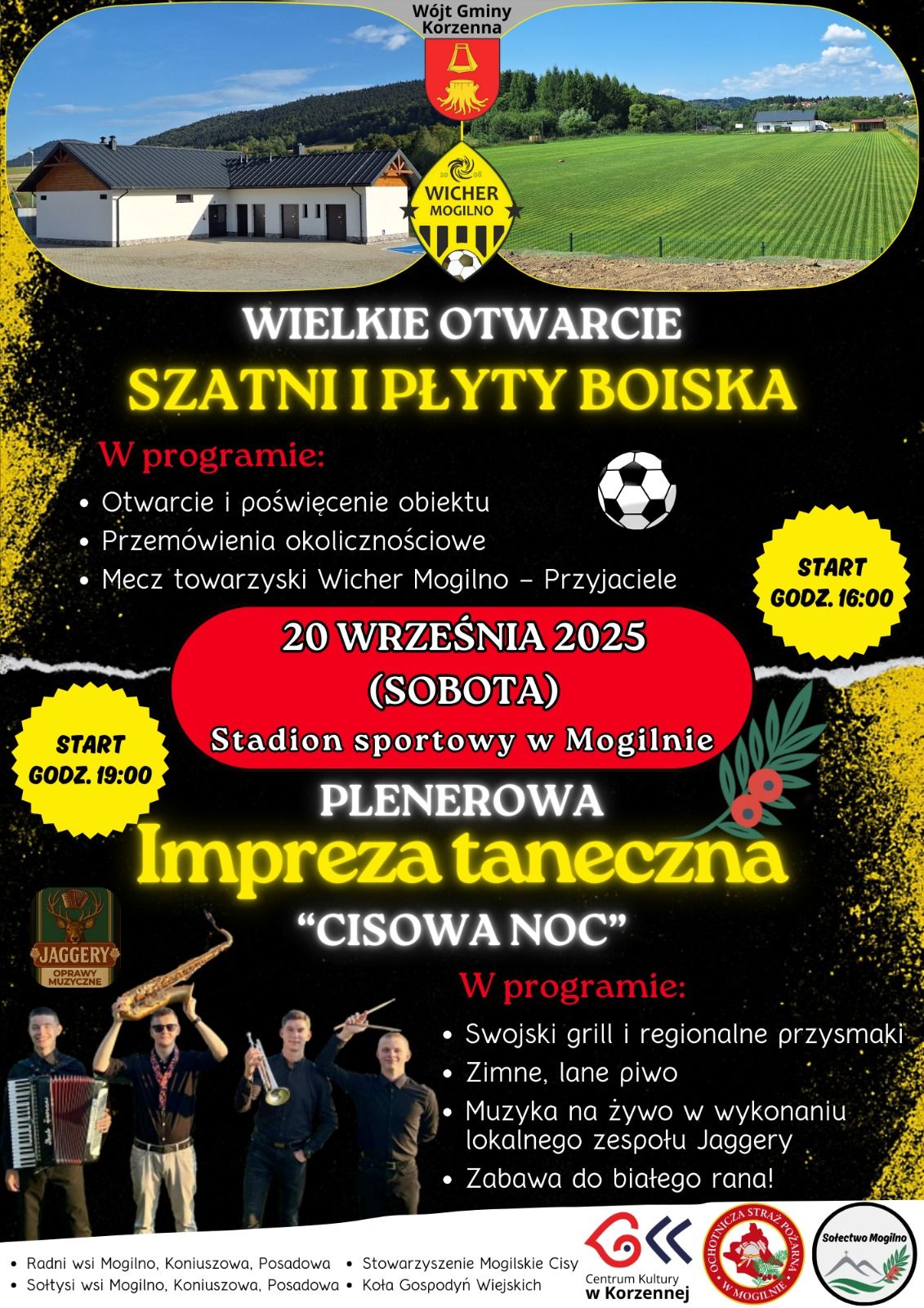 Konkretnie nastąpi ono w sobotę (tj. 20.09.2025 r.) o godzinie 16:00. W planie imprezy jest poświecenie wykonanego dzieła oraz przemówienia okolicznościowe lokalnych dygnitarzy. Następnie na boisku zmierzą się piłkarze Wichra Mogilno z Przyjacielami Klubu. Po części oficjalniej przyjdzie czas na plenerową imprezę taneczna pn. "Cisowa noc". Podczas niej nie zabraknie swojskiego grilla, regionalnych przysmaków, zimnych napojów oraz wspaniałej zabawy. O oprawę muzyczną zadba zespół "Jaggery". Warto dodać, iż nad całością Patronat Honorowy objął Wójt Gminy Korzenna - Leszek Skowron.